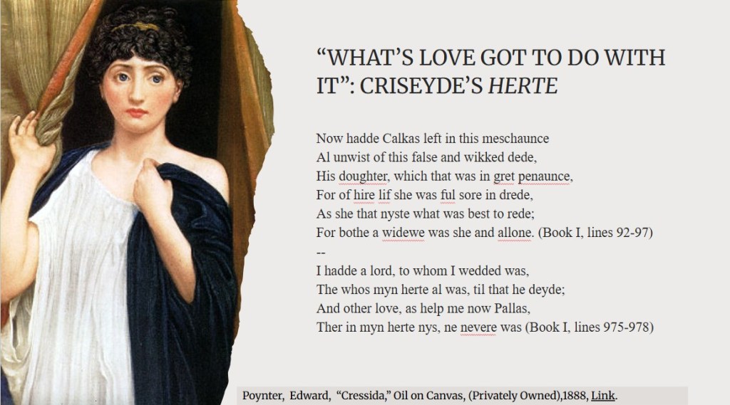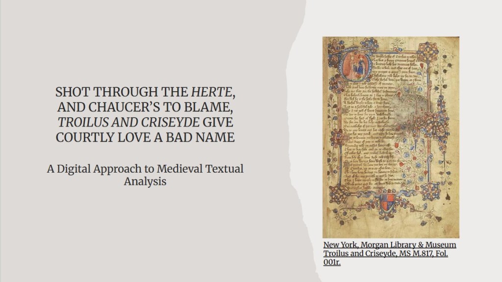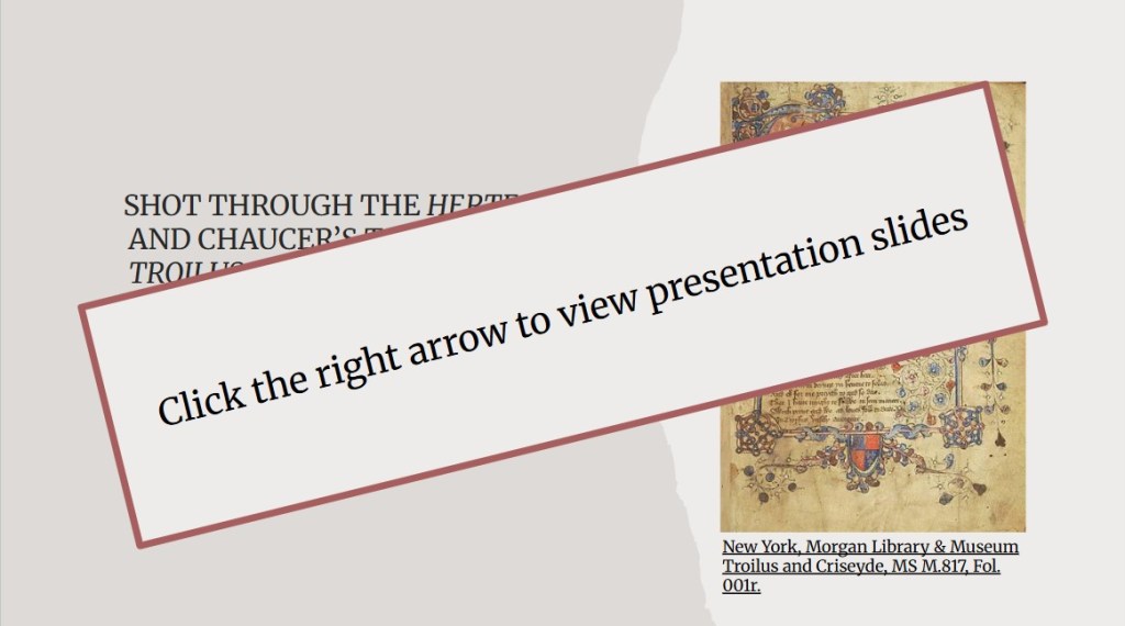 Below, you can view an excerpt from the presentation: “Shot Through the Herte, and Chaucer’s to Blame, Troilus and Criseyde Give Courtly Love a Bad Name.”