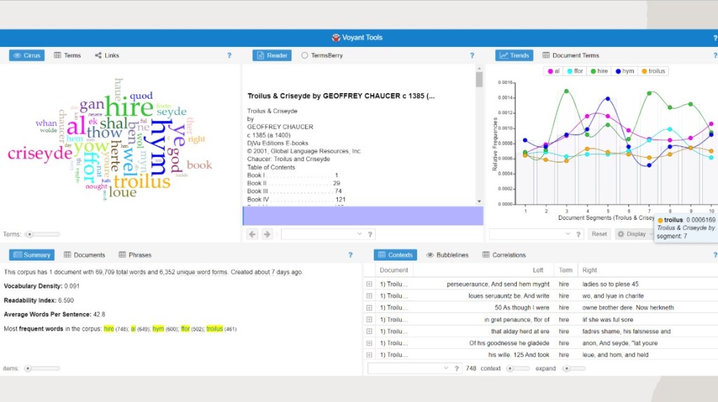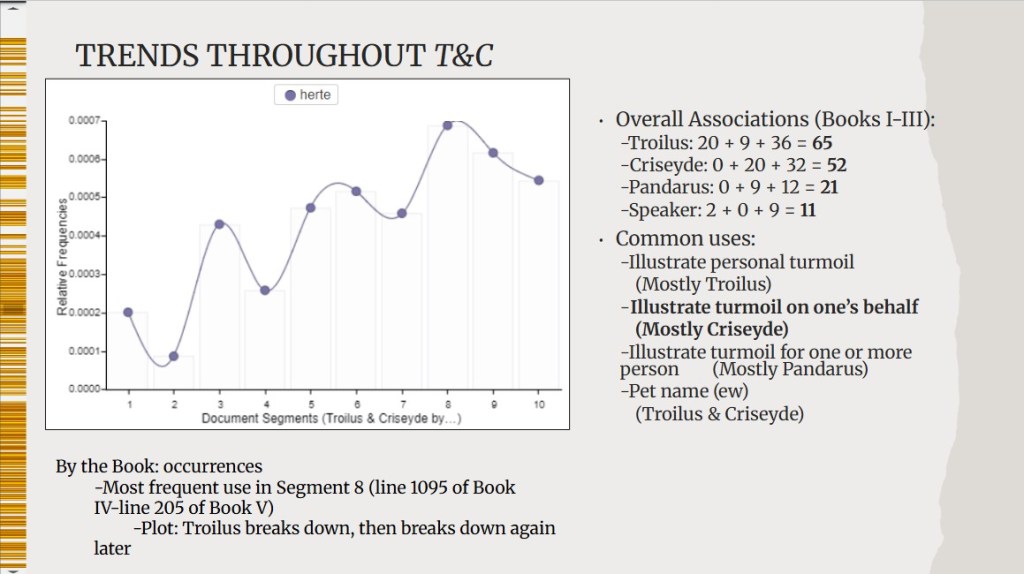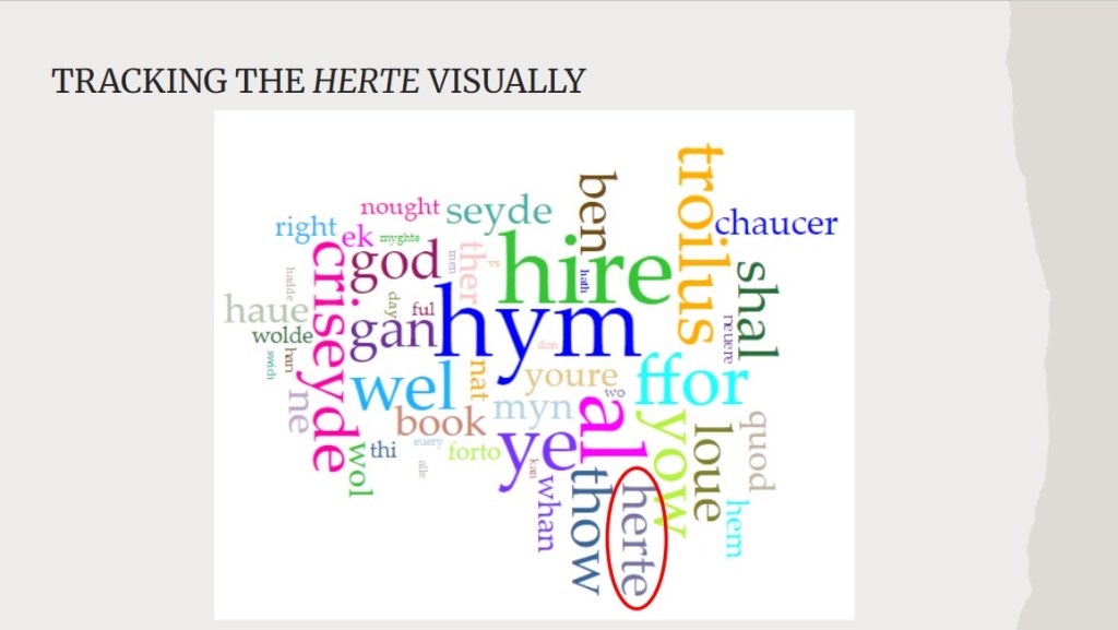 This project was completed in the Spring 2022 section of Dr. Howes’ Chaucer & Affect class. Throughout the semester, we examined Chaucer’s use of affect and emotions in his work. As one of his foundational works, Troilus and Criseyde presents a complex view of courtly love that simultaneously celebrates and critiques how love affects the body. Both characters experience the physical effects of love through the framework of the courtly love tradition, with a key component being its physical effects on the heart. Often, these feelings are painful and they manifest in unique ways for each character. I used Voyant Tools to analyze Chaucer’s use of the herte and wrote a traditional seminar paper, which can be read here.